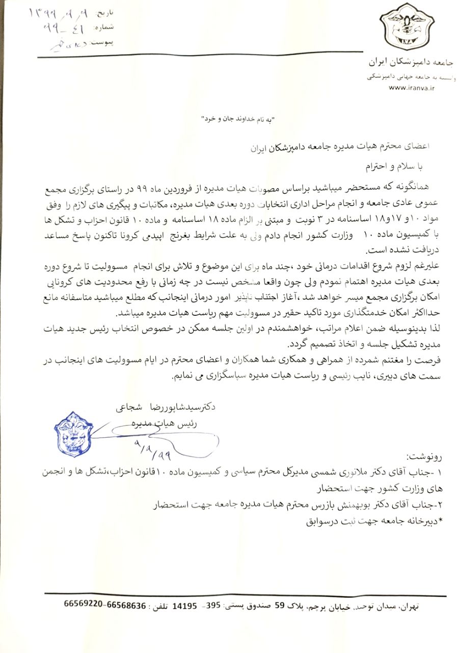 به گزارش دامپزشک نیوز ، دکترشجاعی رئیس هیات مدیره جامعه دامپزشکان ایران به خبرنگار دامپزشک نیوز اعلام کرد طی نامه ای با شرح طولانی شدن روند تایید کمیسیون ماده ۱۰ وزارت کشور جهت برگزاری مجمع عمومی سالانه جامعه و برگزاری انتخابات دوره جدید هیات مدیره جامعه بعلت ادامه وضعیت محدودیت های اپیدمی کرونا ؛ از هیات مدیره درخواست نمود بعلت لزوم شروع اقدامات درمانی خود که به تاخیر افتاده است یکی دیگر از اعضای هیات مدیره را جهت جلوگیری از هرگونه وقفه احتمالی در امور جاری جامعه برای سمت رییس هیات مدیره انتخاب نمایند.