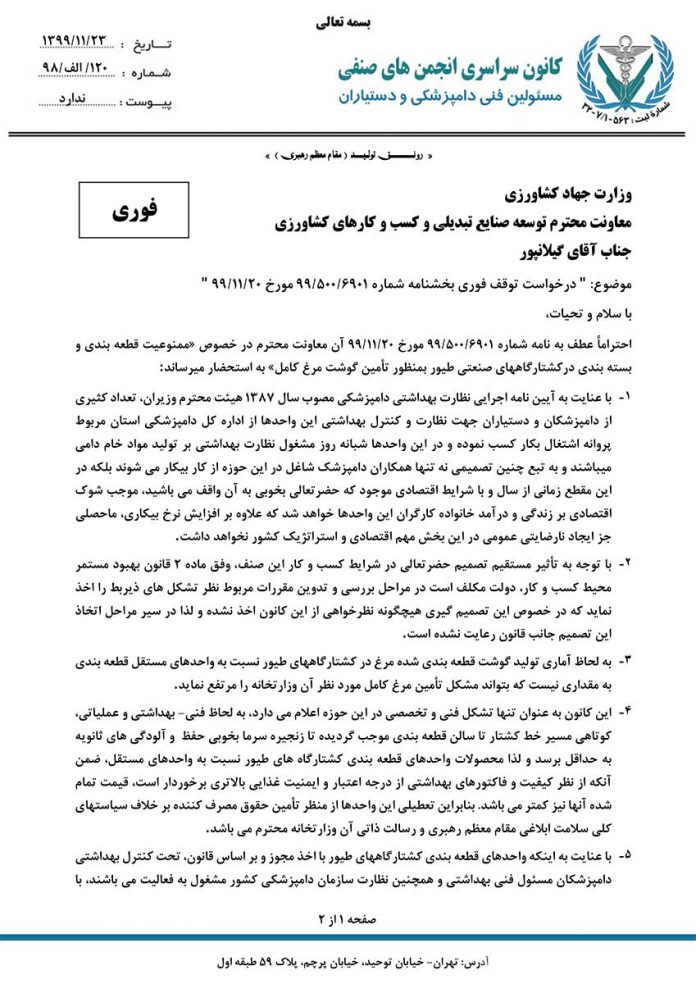 به گزارش دامپزشک نیوز به نقل از انجمن دامپزشکی تهران، در پی اعلام ممنوعيت قطعه بندى و بسته بندى دركشتارگاههاى صنعتی طيور بمنظور تأمین گوشت مرغ کامل توسط معاونت توسعه صنایع تبدیلی و کسب و کارهای کشاورزی وزارت جهاد کشاورزی و در پی آن ابلاغ بخشنامه توسط سازمان دامپزشکی کشور جهت اجرا، کانون سراسری انجمن های صنفی مسئولین فنی دامپزشکی و دستیاران طی نامه ای به گیلانپور، ضمن تبیین تبعات غیر قابل جبران بهداشتی و اجتماعی تصمیم اتخاذ شذه، خواستار توقف فوری آن شد. گفتنی است کانون به منظور حفظ حقوق مصرف کننده و همچنین اعضای خود تا حصول نتیجه مطلوب و لغو بخشنامه، بطور جد پیگیری های لازم را از مراجع ذیصلاح انجام خواهد داد.